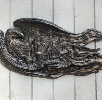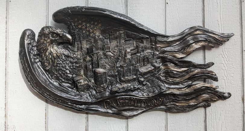This sculptural piece captures the spirit of Buffalo, NY, through the powerful image of an eagle spreading its wings over the cityscape. As a symbol of freedom and strength, the eagle appears to embrace the city, reflecting its rich history, resilience, and revival.